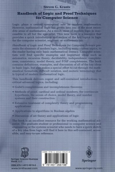 1 Notation and First-Order Logic.- 1.1 The Use of Connectives.- 1.2 Truth Values and Truth Tables.- 1.3 The Use of Quantifiers.- 1.4 Gödel's Completeness Theorem.- 1.5 Second-Order Logic.- 2 Semantics and Syntax.- 2.1 Elementary Symbols.- 2.2 Well-Formed Formulas or wffs [Syntax].- 2.3 Free and Bound Variables (Syntax).- 2.4 The Semantics of First-Order Logic.- 3 Axiomatics and Formalism in Mathematics.- 3.1 Basic Elements.- 3.2 Models.- 3.3 Consistency.- 3.4 Gödel's Incompleteness Theorem.- 3.5 Decidability and Undecidability.- 3.6 Independence.- 4 The Axioms of Set Theory.- 4.1 Introduction.- 4.2 Axioms and Discussion.- 4.3 Concluding Remarks.- 5 Elementary Set Theory.- 5.1 Set Notation.- 5.2 Sets, Subsets, and Elements.- 5.3 Binary Operations on Sets.- 5.4 Relations and Equivalence Relation.- 5.5 Equivalence Relations.- 5.6 Number Systems.- 5.7 Functions.- 5.8 Cardinal Numbers.- 5.9 A Word About Classes.- 5.10 Fuzzy Set Theory.- 5.11 The Lambda Calculus.- 5.12 Sequences.- 5.13 Bags.- 6 Recursive Functions.- 6.1 Introductory Remarks.- 6.2 Primitive Recursive Functions.- 6.3 General Recursive Functions.- 7 The Number Systems.- 7.1 The Natural Numbers.- 7.2 The Integers.- 7.3 The Rational Numbers.- 7.4 The Real Numbers.- 7.5 The Complex Numbers.- 7.6 The Quaternions.- 7.7 The Cayley Numbers.- 7.8 Nonstandard Analysis.- 8 Methods of Mathematical Proof.- 8.1 Axiomatics.- 8.2 Proof by Induction.- 8.3 Proof by Contradiction.- 8.4 Direct Proof.- 8.5 Other Methods of Proof.- 9 The Axiom of Choice.- 9.1 Enunciation of the Axiom.- 9.2 Examples of the Use of the Axiom of Choice.- 9.3 Consequences of the Axiom of Choice.- 9.4 Paradoxes.- 9.5 The Countable Axiom of Choice.- 9.6 Consistency of the Axiom of Choice.- 9.7 Independence of the Axiom of Choice.- 10 Proof Theory.-10.1 General Remarks.- 10.2 Cut Elimination.- 10.3 Propositional Resolution.- 10.4 Interpolation.- 10.5 Finite Type.- 10.6 Beth's Definability Theorem.- 11 Category Theory.- 11.1 Introductory Remarks.- 11.2 Metacategories and Categories.- 12 Complexity Theory.- 12.1 Preliminary Remarks.- 12.2 Polynomial Complexity.- 12.3 Exponential Complexity.- 12.4 Two Tables for Complexity Theory.- 12.5 Problems of Class P.- 12.6 Problems of Class NP.- 12.7 NP-Completeness.- 12.8 Cook's Theorem.- 12.9 Examples of NP-Complete Problems.- 12.10 More on P/NP.- 12.11 Descriptive Complexity Theory.- 13 Boolean Algebra.- 13.1 Description of Boolean Algebra.- 13.2 Axioms of Boolean Algebra.- 13.3 Theorems in Boolean Algebra.- 13.4 Illustration of the Use of Boolean Logic.- 14 The Word Problem.- 14.1 Introductory Remarks.- 14.2 What Is a Group?.- 14.3 What Is a Free Group?.- 14.4 The Word Problem.- 14.5 Relations and Generators.- 14.6 Amalgams.- 14.7 Description of the Word Problem.- List of Notation from Logic.- Glossary of Terms from Mathematical and Sentential Logic.- A Guide to the Literature.