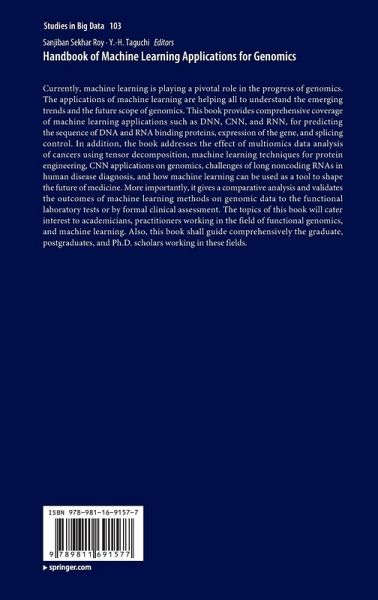 Currently, machine learning is playing a pivotal role in the progress of genomics. The applications of machine learning are helping all to understand the emerging trends and the future scope of genomics. This book provides comprehensive coverage of machine learning applications such as DNN, CNN, and RNN, for predicting the sequence of DNA and RNA binding proteins, expression of the gene, and splicing control. In addition, the book addresses the effect of multiomics data analysis of cancers using tensor decomposition, machine learning techniques for protein engineering, CNN applications on genomics, challenges of long noncoding RNAs in human disease diagnosis, and how machine learning can be used as a tool to shape the future of medicine. More importantly, it gives a comparative analysis and validates the outcomes of machine learning methods on genomic data to the functional laboratory tests or by formal clinical assessment. The topics of this book will cater interest to academicians, practitioners working in the field of functional genomics, and machine learning. Also, this book shall guide comprehensively the graduate, postgraduates, and Ph.D. scholars working in these fields.
