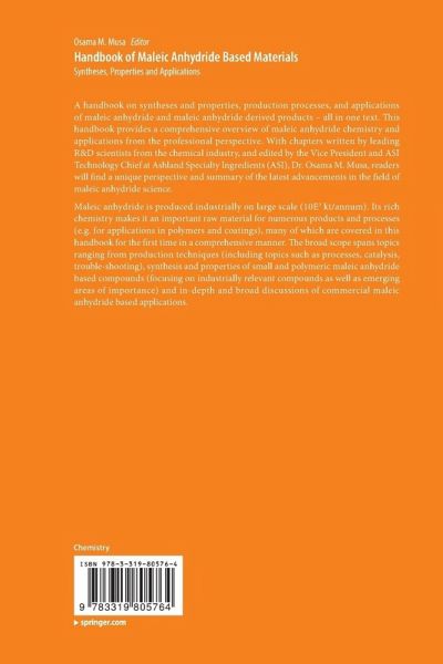 A handbook on syntheses and properties, production processes, and applications of maleic anhydride and maleic anhydride derived products - all in one text. This handbook provides a comprehensive overview of maleic anhydride chemistry and applications from the professional perspective. With chapters written by leading R&D scientists from the chemical industry, and edited by the Vice President and ASI Technology Chief at Ashland Specialty Ingredients (ASI), Dr. Osama M. Musa, readers will find a unique perspective and summary of the latest advancements in the field of maleic anhydride science. Maleic anhydride is produced industrially on large scale (10E3 kt/annum). Its rich chemistry makes it an important raw material for numerous products and processes (e.g. for applications in polymers and coatings), many of which are covered in this handbook for the first time in a comprehensive manner. The broad scope spans topics ranging from production techniques (including topics such as processes, catalysis, trouble-shooting), synthesis and properties of small and polymeric maleic anhydride based compounds (focusing on industrially relevant compounds as well as emerging areas of importance) and in-depth and broad discussions of commercial maleic anhydride based applications.