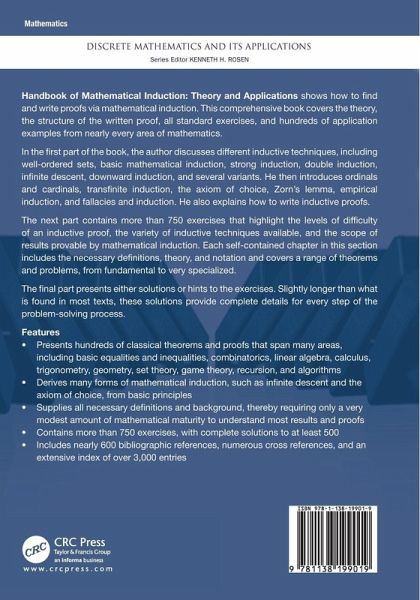 Handbook of Mathematical Induction: Theory and Applications shows how to find and write proofs via mathematical induction. This comprehensive book covers the theory, the structure of the written proof, all standard exercises, and hundreds of application examples from nearly every area of mathematics. In the first part of the book, the author discusses different inductive techniques, including well-ordered sets, basic mathematical induction, strong induction, double induction, infinite descent, downward induction, and several variants. He then introduces ordinals and cardinals, transfinite induction, the axiom of choice, Zorn's lemma, empirical induction, and fallacies and induction. He also explains how to write inductive proofs. The next part contains more than 750 exercises that highlight the levels of difficulty of an inductive proof, the variety of inductive techniques available, and the scope of results provable by mathematical induction. Each self-contained chapter in this section includes the necessary definitions, theory, and notation and covers a range of theorems and problems, from fundamental to very specialized. The final part presents either solutions or hints to the exercises. Slightly longer than what is found in most texts, these solutions provide complete details for every step of the problem-solving process.