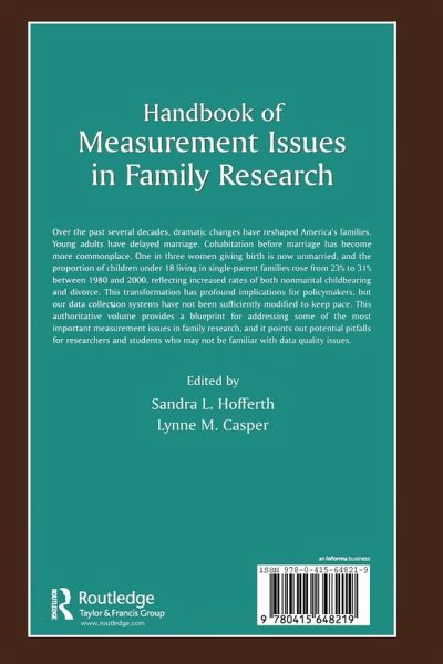 Dramatic societal changes have reshaped America's families. Young adults have delayed marriage, and cohabitation before marriage has become commonplace. One in three women giving birth is unmarried, and the proportion of children under 18 living in single-parent families rose from 23 to 31 percent between 1980 and 2000, reflecting increased rates of both nonmarital childbearing and divorce. This authoritative volume offers a blueprint for addressing some of the most important measurement issues in family research, and it points out potential pitfalls for researchers and students who may not be familiar with data quality issues. The Handbook of Measurement Issues in Family Research will appeal to scholars in the departments of psychology, sociology, and population studies, as well as researchers working in governmental agencies.