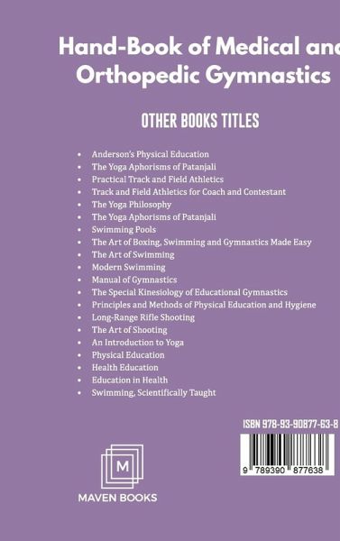 The classification of Gymnastics, Gymnastic apparatus, Gymnastic terminology, The education of a gymnast, Gymnastic positions, Fundamental positions, Gymnastic movements, Free standing movements, Massagemovements, General rules for gymnastic treatment, Gymnastic prescription and daily treatment, The respiration during gymnastic treatment, Amount of time sufficient for the gymnastic treatment, The gymnast's position and relation to the patient, Diseases of the circulatory organs, Diseases of the genitourinary organs, Diseases of the kidneys, Diseases of the bladder, Diseases of the male genital organs, Diseases of the nervous system, Peripheral nervous diseases, Vasomotor and trophic neurosis, Diseases of the spinal cord, Cerebral diseases, Neurosis without any known anatomical causes, Diseases of the muscles, Constitutional diseases, Diseases of the bones and joints, Spinal curvatures, Dietetic gymnastics