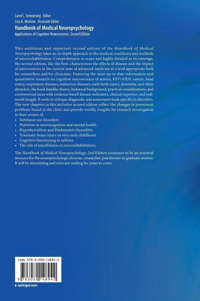This ambitious and important second edition of the Handbook of Medical Neuropsychology takes an in-depth approach to the medical conditions and methods of neurorehabilitation. Comprehensive in scope and highly detailed in its coverage, the second edition, like the first, characterizes the effects of disease and the impact of interventions in the current state of advanced medicine at a level appropriate both for researchers and for clinicians. Featuring the most up-to-date information and quantitative research on cognitive neuroscience of autism, HIV/AIDS, cancer, head injury, respiratory diseases, endocrine diseases, early birth injury, dementia, and other disorders, the book handles theory, historical background, practical considerations, and controversial areas with evidence based disease indicators, clinical expertise, and real-world insight. It seeks to critique diagnostic and assessment tools specific to disorders. The new chapters in this inclusive second editionreflect the changes in prominent problems found in the clinic and provide worthy insights for research investigation in their review of: