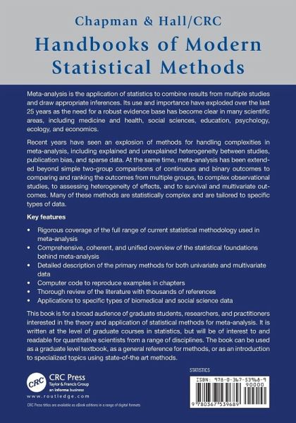 Rigorous coverage of the full range of current statistical methodology used in meta-analysisComprehensive, coherent, and unified overview of the statistical foundations behind meta-analysisDetailed description of the primary methods for both univariate and multivariate dataComputer code to reproduce examples in chaptersThorough review of the literature with thousands of referencesApplications to specific types of biomedical and social science dataSupplementary website with code, data, sample chapters, and errata