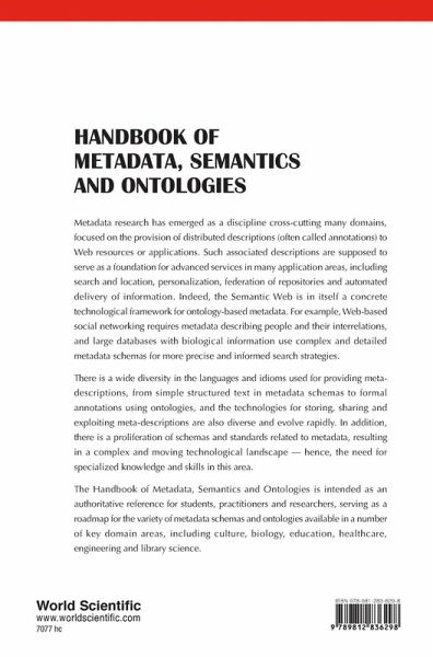 Metadata research has emerged as a discipline cross-cutting many domains, focused on the provision of distributed descriptions (often called annotations) to Web resources or applications. Such associated descriptions are supposed to serve as a foundation for advanced services in many application areas, including search and location, personalization, federation of repositories and automated delivery of information. Indeed, the Semantic Web is in itself a concrete technological framework for ontology-based metadata. For example, Web-based social networking requires metadata describing people and their interrelations, and large databases with biological information use complex and detailed metadata schemas for more precise and informed search strategies. There is a wide diversity in the languages and idioms used for providing meta-descriptions, from simple structured text in metadata schemas to formal annotations using ontologies, and the technologies for storing, sharing and exploiting meta-descriptions are also diverse and evolve rapidly. In addition, there is a proliferation of schemas and standards related to metadata, resulting in a complex and moving technological landscape hence, the need for specialized knowledge and skills in this area. The Handbook of Metadata, Semantics and Ontologies is intended as an authoritative reference for students, practitioners and researchers, serving as a roadmap for the variety of metadata schemas and ontologies available in a number of key domain areas, including culture, biology, education, healthcare, engineering and library science.