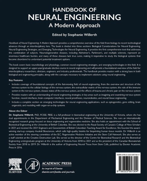 Handbook of Neural Engineering: A Modern Approach provides a comprehensive overview of the field from biology to recent technological advances through an interdisciplinary lens. The book is divided into three sections: 1) Biological Considerations for Neural Engineering, 2) Neural Engineering Strategies, and 3) Emerging Technologies for Neural Engineering. It provides the first comprehensive text that addresses this combination of subjects. Neurodegenerative diseases, including Alzheimer’s, Parkinson’s and Multiple Sclerosis, represent an enormous healthcare burden, and many of these diseases lack true cures, making it imperative to study the biological systems that become disordered to understand potential treatment options. This book covers the basic neurobiology and physiology, common neural engineering strategies, and emerging technologies in this field. It is designed to support an upper year/graduate elective course in neural engineering, and will provide a foundational overview of the field for interdisciplinary researchers, clinicians, engineers, and industry professionals. The handbook provides readers with a strong base in both biological and engineering principles along with the concepts necessary to implement solutions using Neural Engineering.