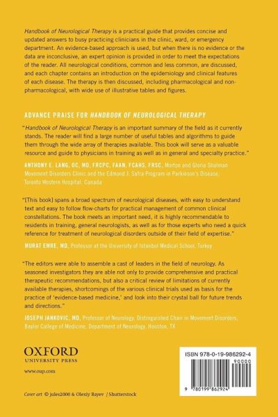 This is practical book on neurological therapy. It is aimed at giving concise and updated answers to busy practicing clinicians in the clinic, ward or emergency department. An evidence-based approach is used, but when there is no evidence or the data are inconclusive, an expert opinion is always being given in order to meet the expectations of the reader. All neurological conditions (common and less common) are discussed; each chapter has a similar format, and contains an initial brief introduction on the epidemiology and clinical features of each disease. The therapy is then discussed, including pharmacological and non-pharmacological, with wide use of Tables
