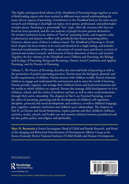 Volume 5, The Practice of Parenting, describes the nuts-and-bolts of parenting as well as the promotion of positive parenting practices. Parents meet the biological, physical, and health requirements of children. Parents interact with children socially. Parents stimulate children to engage and understand the environment and to enter the world of learning. Parents provision, organize, and arrange their children's home and local environments and the media to which children are exposed. Parents also manage child development vis-à-vis childcare, school, the circles of medicine and law, as well as other social institutions through their active citizenship. The chapters in Part I, on Practical Parenting, review the ethics of parenting, parenting and the development of children's self-regulation, discipline, prosocial and moral development, and resilience as well as children's language, play, cognitive, and academic achievement and children's peer relationships. The chapters in Part II, on Parents and Social Institutions, explore parents and their children's childcare, activities, media, schools, and healthcare and examine relations between parenthood and the law, public policy, and religion and spirituality.