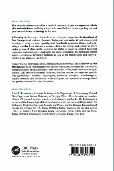 "Provides a detailed summary of pest management principles and techniques, outlining a broad selection of critical issues regarding current practice and future technology in this area. Discusses the role of soils, weather, and surrounding habitats in regulating pest occurrence and severity."