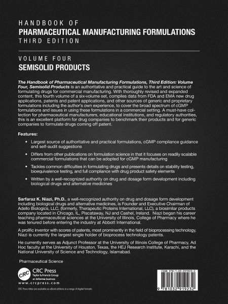 The Handbook of Pharmaceutical Manufacturing Formulations, Third Edition: Volume Four, Semisolid Products is an authoritative and practical guide to the art and science of formulating drugs for commercial manufacturing. With thoroughly revised and expanded content, this fourth volume of a six-volume set, compiles data from FDA and EMA new drug applications, patents and patent applications, and other sources of generic and proprietary formulations including author's own experience, to cover the broad spectrum of cGMP formulations and issues in using these formulations in a commercial setting. A must-have collection for pharmaceutical manufacturers, educational institutions, and regulatory authorities, this is an excellent platform for drug companies to benchmark their products and for generic companies to formulate drugs coming off patent.
