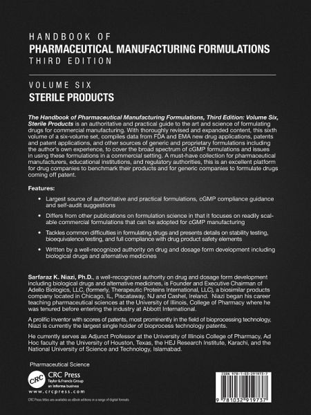 The Handbook of Pharmaceutical Manufacturing Formulations, Third Edition: Volume Six, Sterile Products is an authoritative and practical guide to the art and science of formulating drugs for commercial manufacturing. With thoroughly revised and expanded content, this sixth volume of a six-volume set, compiles data from FDA and EMA new drug applications, patents and patent applications, and other sources of generic and proprietary formulations including author's own experience, to cover the broad spectrum of cGMP formulations and issues in using these formulations in a commercial setting. A must-have collection for pharmaceutical manufacturers, educational institutions, and regulatory authorities, this is an excellent platform for drug companies to benchmark their products and for generic companies to formulate drugs coming off patent.