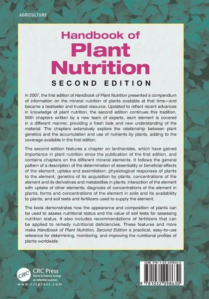 In 2007, the first edition of Handbook of Plant Nutrition presented a compendium of information on the mineral nutrition of plants available at that time-and became a bestseller and trusted resource. Updated to reflect recent advances in knowledge of plant nutrition, the second edition continues this tradition. With chapters written by a new team of experts, each element is covered in a different manner, providing a fresh look and new understanding of the material. The chapters extensively explore the relationship between plant genetics and the accumulation and use of nutrients by plants, adding to the coverage available in the first edition. The second edition features a chapter on lanthanides, which have gained importance in plant nutrition since the publication of the first edition, and contains chapters on the different mineral elements. It follows the general pattern of a description of the determination of essentiality or beneficial effects of the element, uptake and assimilation, physiological responses of plants to the element, genetics of its acquisition by plants, concentrations of the element and its derivatives and metabolites in plants, interaction of the element with uptake of other elements, diagnosis of concentrations of the element in plants, forms and concentrations of the element in soils and its availability to plants, soil tests and fertilizers used to supply the element. The book demonstrates how the appearance and composition of plants can be used to assess nutritional status and the value of soil tests for assessing nutrition status. It also includes recommendations of fertilizers that can be applied to remedy nutritional deficiencies. These features and more make Handbook of Plant Nutrition, Second Edition a practical, easy-to-use reference for determining, monitoring, and improving the nutritional profiles of plants worldwide.