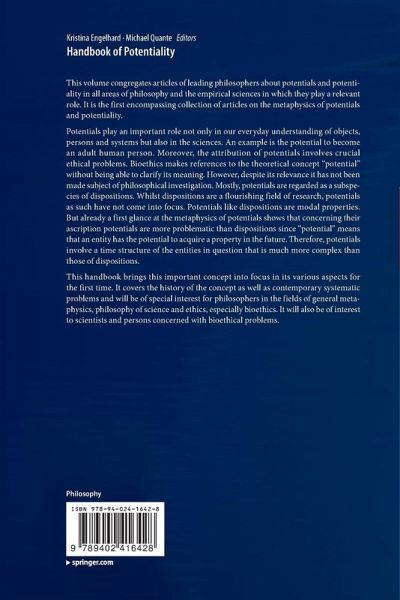 Introduction; Kristina Engelhard.- Part I The Concept of Potentiality in the History of Philosophy - Aristotle.- 1 Potentiality in Aristotle's Metaphysics; Anna Marmodoro.- 2 Potentiality in Aristotle's Physics and Biology; Stephen Makin.- 3 Potentiality in Aristotle's Psychology and Ethics; Frans A. J. de Haas.- Part II The Concept of Potentiality in the History of Philosophy - Medieval Philosophy.- 4 Potentiality in Classical Arabic Thought; Taneli Kukkonen.- 5 Potentiality in the Late Middle Ages - the Latin Tradition; Stephan Schmid.- Part III The Concept of Potentiality in the History of Philosophy - Early Modern Philosophy.- 6 Potentiality in Rationalism; Michael-Thomas Liske.- 7 Potentiality in British Empiricism; Katia Saporiti.- Part IV The Metaphysics of Potentials.- 8 Real Potential; Jennifer McKitrick.- 9 Powers and Potentiality; Stephen Mumford / Rani Lill Anjum.- 10 From Potentiality to Possibility; Barbara Vetter.- Part V Potentiality in Specific Fields of Philosophy.- 11 Potentialities in the Philosophy of Mind; Frank Hofmann.- 12 Potentiality in Bioethics; Marco Stier.- Part VI Potentiality in the Sciences.- 13 Potentiality in Physics ; Max Kistler.- 14 Aspects of the Concept of Potentiality in Chemistry; Robin F. Hendry / Paul Needham.- 15 Potentiality in Biology; Andreas Hüttemann / Marie I. Kaiser.- About the Contributors.