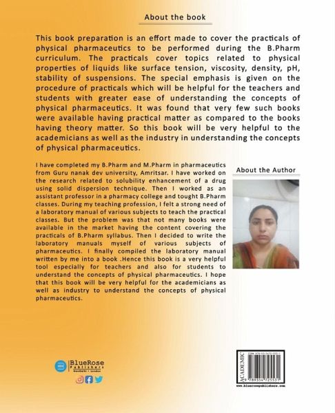 This book preparation is an effort made to cover the practicals of physical pharmaceutics to be performed during the B.Pharm curriculum. The practicals cover topics related to physical properties of liquids like surface tension, viscosity, density, pH, stability of suspensions. Special emphasis is given on the procedure of practicals which will be helpful for the teachers and students with greater ease of understanding the concepts of physical pharmaceutics. It was found that very few such books were available having practical matter as compared to the books having theory matter. So this book will be very helpful to academicians as well as the industry in understanding the concepts of physical pharmaceutics.