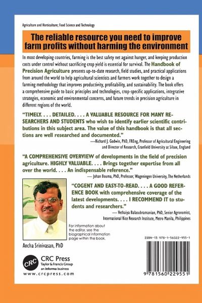 In most developing countries, farming is the best safety net against hunger, and keeping production costs under control without sacrificing crop yield is essential for survival. The Handbook of Precision Agriculture presents up-to-date research, field studies, and practical applications from around the world to help agricultural scientists and farmers work together to design a farming methodology that improves productivity, profitability, and sustainability. The book offers a comprehensive guide to basic principles and technologies, crop-specific applications, integrative strategies, economic…mehr