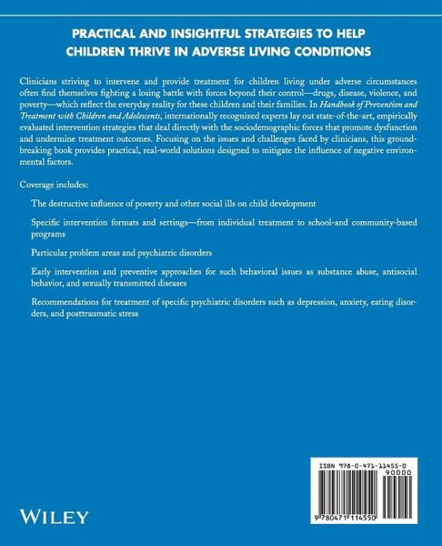 Practical and insightful strategies to help children thrive in adverse living conditions Clinicians striving to intervene and provide treatment for children living under adverse circumstances often find themselves fighting a losing battle with forces beyond their control-drugs, disease, violence, and poverty-which reflect the everyday reality for these children and their families. In Handbook of Prevention and Treatment with Children and Adolescents, internationally recognized experts lay out state-of-the-art, empirically evaluated intervention strategies that deal directly with the sociodemographic forces that promote dysfunction and undermine treatment outcomes. Focusing on the issues and challenges faced by clinicians, this groundbreaking book provides practical, real-world solutions designed to mitigate the influence of negative environmental factors. Coverage includes: * The destructive influence of poverty and other social ills on child development * Specific intervention formats and settings-from individual treatment to school- and community-based programs * Particular problem areas and psychiatric disorders * Early intervention and preventive approaches for such behavioral issues as substance abuse, antisocial behavior, and sexually transmitted diseases * Recommendations for treatment of specific psychiatric disorders such as depression, anxiety, eating disorders, and posttraumatic stress