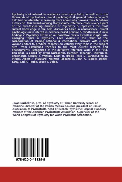 Psychiatry is of interest to academics from many fields, as well as to the thousands of psychiatrists, clinical psychologists & general public who can't help but be interested in learning more about why humans think & behave as they do. This award-winning thirty-volume reference covers every aspect of the ever-fascinating discipline of Psychiatry & represents the most current knowledge in the field, discoveries based in neuroscience, clinical psychology's new interest in evidence-based practice & mindfulness, & new findings in Psychiatry. Offers an authoritative review as well as insight into emerging topics in psychiatry. Each volume is the result of the collaboration of leading national & international scholars with e pert volume editors to produce chapters on virtually every topic in the subject area, from established theories to the most current research and developments. Recognized as the definitive reference work in the field. This Book is edited by Javad Nurbakhsh, HamidehJahangiri, Tristram H. Engelhardt, Stanley J. Watson, Keith H. Brodie, Jack D. Barchas,Fred D. Strider, Albert J. Stunkard, Norman Tabachnick, John A. Talbott, Daniel Tarsy, Carl A. Taube, Bruce T. Volpe.
