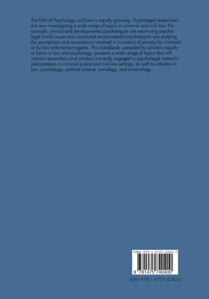 Shari Seidman Diamond Scholars interested in psychology and law are fond of c1aiming origins for psycholegal research that date back four score and three years ago to Hugo von Munsterberg's On the Witness Stand, published in 1908. These early roots can mislead the casual observer about the history of psychology and law. Vigorous and sustained research in the field is a recent phenomenon. It is only 15 years since the first review of psy chology and law appeared in the Annual Review of Psychology (Tapp, 1976). The following year saw the first issue of Law and Human Behavior, the official publication of the American Psychology-Law Society and now the journal of the American Psychological Associ ation's Division of Psychology and Law. Few psychology departments offered even a single course in psychology and law before 1973, while by 1982 1/4 of psychology graduate programs had at least one course, and a number had begun to offer forensic minors and/or joint J. D. / Ph. D. programs (Freeman & Roesch, see Chapter 28). Yet this short period of less than 20 years has seen a dramatic level of activity. Its strengths and weaknesses, excitements and disappointments, are aII captured in the collection of chapters published in this first Handbook of Psychology and Law. In describing what we have learned ab out psychology and law, the works included here also reveal the questions we have yet to answer and thus offer a blueprint for activities in the next 20 years.