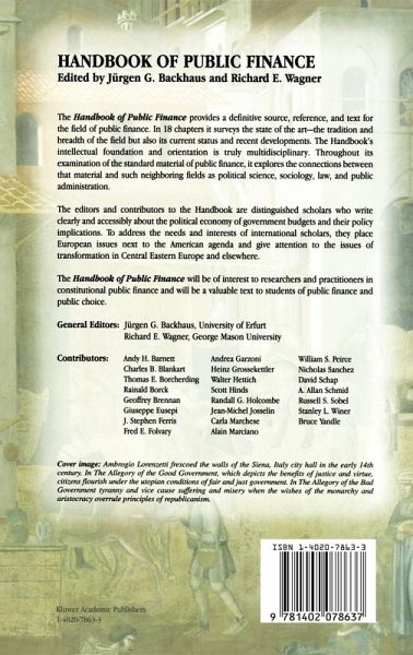 Contributors: Andy H. Barnett, Charles B. Blankart, Thomas E. Borcherding, Rainald Borck, Geoffrey Brennan, Giuseppe Eusepi, J. Stephen Ferris, Fred E. Folvary, Andrea Garzoni, Heinz Grossekettaler, Walter Hettich, Scott Hinds, Randall G. Holcombe, Jean-Michel Josselin, Carla Marchese, Alain Marciano, William S. Peirce, Nicholas Sanchez, David Schap, A. Allan Schmid, Russell S. Sobel, Stanley L. Winer, Bruce Yandle.