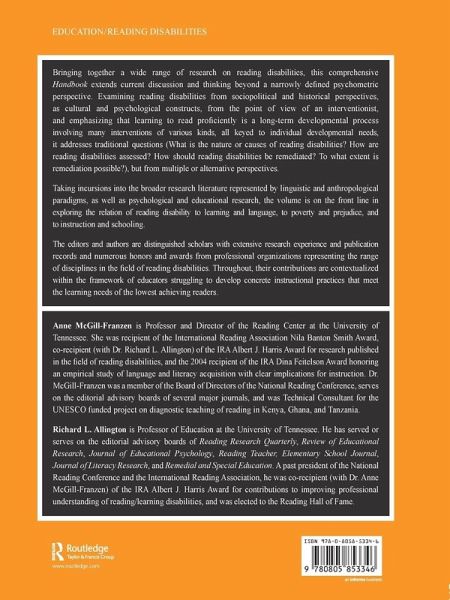 Bringing together a wide range of research on reading disabilities, this comprehensive Handbook extends current discussion and thinking beyond a narrowly defined psychometric perspective. Emphasizing that learning to read proficiently is a long-term developmental process involving many interventions of various kinds, all keyed to individual developmental needs, it addresses traditional questions (What is the nature or causes of reading disabilities? How are reading disabilities assessed? How should reading disabilities be remediated? To what extent is remediation possible?) but from multiple or alternative perspectives. Taking incursions into the broader research literature represented by linguistic and anthropological paradigms, as well as psychological and educational research, the volume is on the front line in exploring the relation of reading disability to learning and language, to poverty and prejudice, and to instruction and schooling. The editors and authors are distinguished scholars with extensive research experience and publication records and numerous honors and awards from professional organizations representing the range of disciplines in the field of reading disabilities. Throughout, their contributions are contextualized within the framework of educators struggling to develop concrete instructional practices that meet the learning needs of the lowest achieving readers.