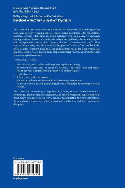 This handbook provides a guide for individualized, responsive, and meaningful care to patients with severe mental illness. It begins with an overview of the foundational aspects of recovery - definitions and assessment, recovery principles, recovery research, and applications of recovery principles in in inpatient psychiatry. Subsequent chapters offer in-depth analyses of provider competencies, the patient's role in personal choices and decision making, and the deeper healing goals of recovery. The handbook also offers detailed treatment modalities, including cognitive remediation, psychological and psychiatric services, nursing and occupational therapy services, peer support, and pharmacological treatment. Featured topics include:Sexuality and sexual health in the inpatient psychiatric setting. The power of stigma and the usage of SAMHSA (Substance Abuse and Mental Health Services Administration) principles to combat stigma. Legal advocacy. Self-advocacy and empowerment. Methods to enhance resilience and sustain recovery in inpatients. Common errors and solutions during the transformation to recovery-oriented systems.The Handbook of Recovery in Inpatient Psychiatry is a must-have resource for researchers, graduate students, clinicians, and related professionals/practitioners in psychology, psychiatry, social work, nursing, rehabilitation therapy, occupational therapy, physical therapy, and allied professionals in related mental health and medical disciplines.
