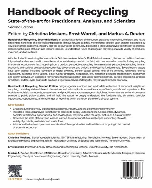 Handbook of Recycling, Second Edition is an authoritative review of the current state of recycling, reuse and reclamation processes commonly implemented today, and how they interact with one another. Fully updated to cover recent developments in the field, this second edition has also been restructured to cover general aspects of recycling, applications, technology, recovery and collection, economics, governance and policy. Several new chapters on global recycled material flows, sludges, reinforced plastics, and landfill mining have been added. It concludes with a review of the policy and economic implications, including the impact of recycling on energy use, sustainable development, and the environment. This book is a crucial aid to students and researchers in a range of disciplines, from materials and environmental science to public policy studies.