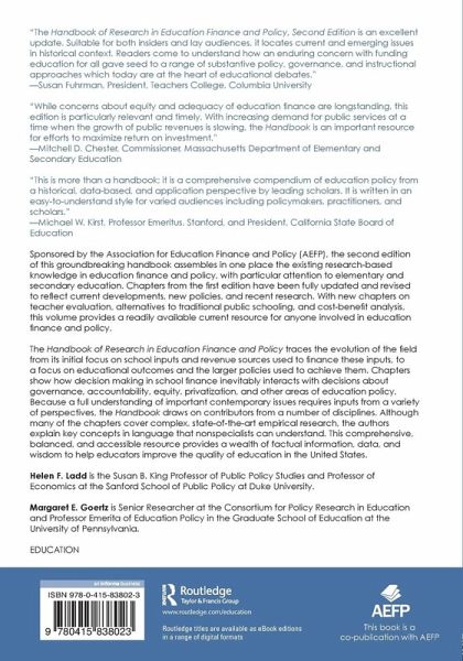 Sponsored by the Association for Education Finance and Policy (AEFP), the second edition of this groundbreaking handbook assembles in one place the existing research-based knowledge in education finance and policy, with particular attention to elementary and secondary education. Chapters from the first edition have been fully updated and revised to reflect current developments, new policies, and recent research. With new chapters on teacher evaluation, alternatives to traditional public schooling, and cost-benefit analysis, this volume provides a readily available current resource for anyone involved in education finance and policy. The Handbook of Research in Education Finance and Policy traces the evolution of the field from its initial focus on school inputs and revenue sources used to finance these inputs, to a focus on educational outcomes and the larger policies used to achieve them. Chapters show how decision making in school finance inevitably interacts with decisions about governance, accountability, equity, privatization, and other areas of education policy. Because a full understanding of important contemporary issues requires inputs from a variety of perspectives, the Handbook draws on contributors from a number of disciplines. Although many of the chapters cover complex, state-of-the-art empirical research, the authors explain key concepts in language that non-specialists can understand. This comprehensive, balanced, and accessible resource provides a wealth of factual information, data, and wisdom to help educators improve the quality of education in the United States.