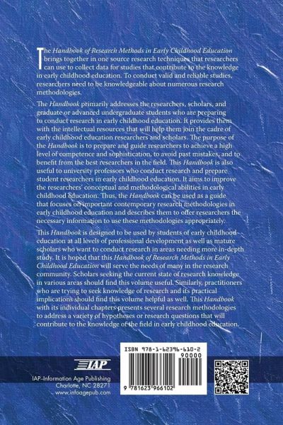 A volume in Contemporary Perspectives in Early Childhood Education Series Editor Olivia N. Saracho, University of Maryland The Handbook of Research Methods in Early Childhood Education brings together in one source research techniques that researchers can use to collect data for studies that contribute to the knowledge in early childhood education. To conduct valid and reliable studies, researchers need to be knowledgeable about numerous research methodologies. The Handbook primarily addresses the researchers, scholars, and graduate or advanced undergraduate students who are preparing to conduct research in early childhood education. It provides them with the intellectual resources that will help them join the cadre of early childhood education researchers and scholars. The purpose of the Handbook is to prepare and guide researchers to achieve a high level of competence and sophistication, to avoid past mistakes, and to benefit from the best researchers in the field. This Handbook is also useful to university professors who conduct research and prepare student researchers in early childhood education. It aims to improve the researchers' conceptual and methodological abilities in early childhood education. Thus, the Handbook can be used as a guide that focuses on important contemporary research methodologies in early childhood education and describes them to offer researchers the necessary information to use these methodologies appropriately. This Handbook is designed to be used by students of early childhood education at all levels of professional development as well as mature scholars who want to conduct research in areas needing more in-depth study. It is hoped that this Handbook of Research Methods in Early Childhood Education will serve the needs of many in the research community. Scholars seeking the current state of research knowledge in various areas should find this volume useful. Similarly, practitioners who are trying to seek knowledge of research and its practical implications should find this volume helpful as well. This Handbook with its individual chapters presents several research methodologies to address a variety of hypotheses or research questions that will contribute to the knowledge of the field in early childhood education.