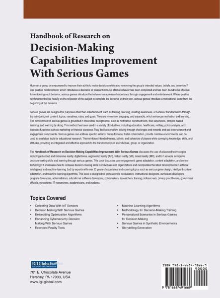 How can a group be empowered to improve their ability to make decisions while also reinforcing the group's intended values, beliefs, and behaviors? Like positive reinforcement, which introduces a desirable or pleasant stimulus after a behavior has been completed and has been found to be effective for reinforcing such behavior, serious games introduce the behavior as a pleasant experience through engagement and entertainment. Where positive reinforcement relies heavily on the willpower of the subject to complete the behavior on their own, serious games introduce a motivational factor from the beginning of the behavior. Serious games are designed for purposes other than entertainment, such as training, learning, creating awareness, or behavior transformation through the introduction of content, topics, narratives, rules, and goals. They are immersive, engaging, and enjoyable, which enhances motivation and learning. The development of serious games is grounded in theoretical backgrounds, such as motivation, constructivism, flow experience, problem-based learning, and learning by doing. This method has been used in a variety of industries, including education, healthcare, military, policy analysis, and business functions such as marketing or financial purposes. They facilitate problem solving through challenges and rewards and use entertainment and engagement components. Serious games can address specific skills for many domains, foster collaboration, provide risk-free environments, and be used as analytical tools for educational research. They reinforce intended values, beliefs, and behaviors of players while conveying knowledge, skills, and attitudes, providing an integrated and effective approach to the transformation of an individual, group, or organization. The Handbook of Research on Decision-Making Capabilities Improvement With Serious Games discusses the use of advanced technologies including extended and immersive reality, digital twins, augmented reality (AR), virtual reality (VR), mixed reality (MR), and IoT sensors to improve decision-making skills and learning through serious games. This book discusses user engagement, game adaptation, content adaptation, and sensor technology. It showcases how to increase decision-making skills in individuals and organizations and incorporates the latest developments in artificial intelligence and machine learning. Led by experts with over 20 years of experience and covering topics such as serious game design, intelligent content adaptation, and machine learning algorithms. This book is designed for professionals in education, instructional designers, curriculum developers, program developers, administrators, educational software developers, policymakers, researchers, training professionals, privacy practitioners, government officials, consultants, IT researchers, academicians, and students.
