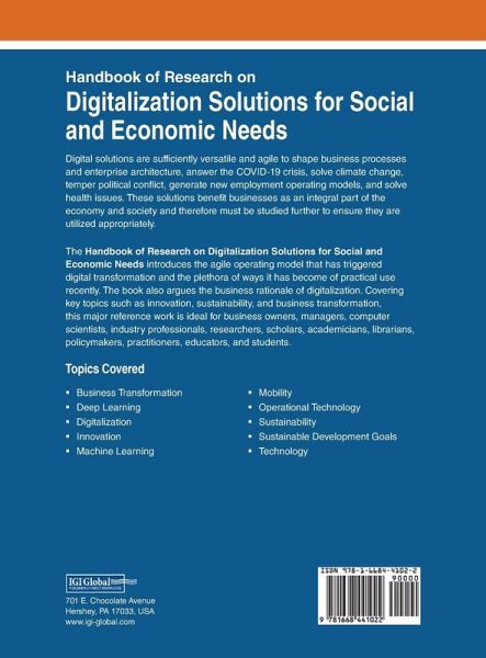 Digital solutions are sufficiently versatile and agile to shape business processes and enterprise architecture, answer the COVID-19 crisis, solve climate change, temper political conflict, generate new employment operating models, and solve health issues. These solutions benefit businesses as an integral part of the economy and society and therefore must be studied further to ensure they are utilized appropriately. The Handbook of Research on Digitalization Solutions for Social and Economic Needs introduces the agile operating model that has triggered digital transformation and the plethora of ways it has become of practical use recently. The book also argues the business rationale of digitalization. Covering key topics such as innovation, sustainability, and business transformation, this major reference work is ideal for business owners, managers, computer scientists, industry professionals, researchers, scholars, academicians, librarians, policymakers, practitioners, educators, and students.