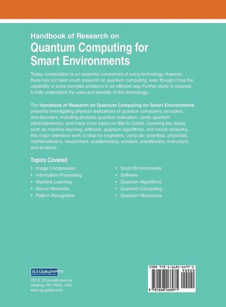Today, computation is an essential component of every technology. However, there has not been much research on quantum computing, even though it has the capability to solve complex problems in an efficient way. Further study is required to fully understand the uses and benefits of this technology. The Handbook of Research on Quantum Computing for Smart Environments presents investigating physical realizations of quantum computers, encoders, and decoders, including photonic quantum realization, cavity quantum electrodynamics, and many more topics on Bits to Qubits. Covering key topics such as machine learning, software, quantum algorithms, and neural networks, this major reference work is ideal for engineers, computer scientists, physicists, mathematicians, researchers, academicians, scholars, practitioners, instructors, and students.