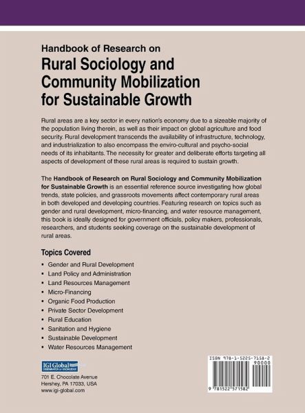 Rural areas are a key sector in every nation's economy due to a sizeable majority of the population living therein, as well as their impact on global agriculture and food security. Rural development transcends the availability of infrastructure, technology, and industrialization to also encompass the enviro-cultural and psycho-social needs of its inhabitants. The necessity for greater and deliberate efforts targeting all aspects of development of these rural areas is required to sustain growth. The Handbook of Research on Rural Sociology and Community Mobilization for Sustainable Growth is an essential reference source investigating how global trends, state policies, and grassroots movements affect contemporary rural areas in both developed and developing countries. Featuring research on topics such as gender and rural development, micro-financing, and water resource management, this book is ideally designed for government officials, policy makers, professionals, researchers, and students seeking coverage on the sustainable development of rural areas.