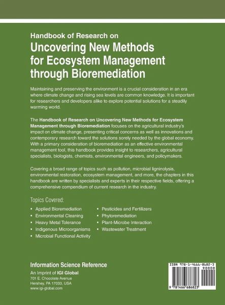 Maintaining and preserving the environment is a crucial consideration in an era where climate change and rising sea levels are common knowledge. It is important for researchers and developers alike to explore potential solutions for a steadily warming world. The Handbook of Research on Uncovering New Methods for Ecosystem Management through Bioremediation focuses on the agricultural industry's impact on climate change, presenting critical concerns as well as innovations and contemporary research toward the solutions sorely needed by the global economy. With a primary consideration of bioremediation as an effective environmental management tool, this handbook provides insight to researchers, agricultural specialists, biologists, chemists, environmental engineers, and policymakers. Covering a broad range of topics such as pollution, microbial ligninolysis, environmental restoration, ecosystem management, and more, the chapters in this handbook are written by specialists and experts in their respective fields, offering a comprehensive compendium of current research in the industry.