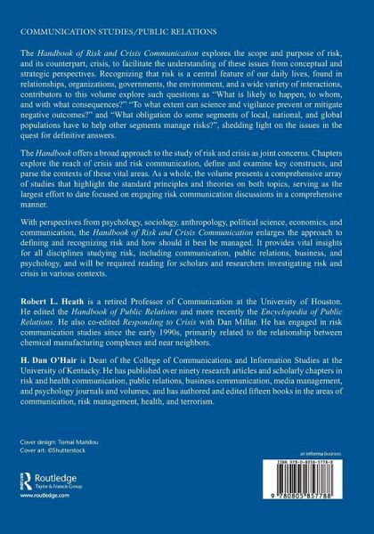 The Handbook of Risk and Crisis Communication explores the scope and purpose of risk, and its counterpart, crisis, to facilitate the understanding of these issues from conceptual and strategic perspectives. With perspectives from psychology, sociology, anthropology, political science, economics, and communication, the Handbook of Risk and Crisis Communication enlarges the approach to defining and recognizing risk and how should it best be managed. It provides vital insights for all disciplines studying risk, including communication, public relations, business, and psychology, and will be required reading for scholars and researchers investigating risk and crisis in various contexts.