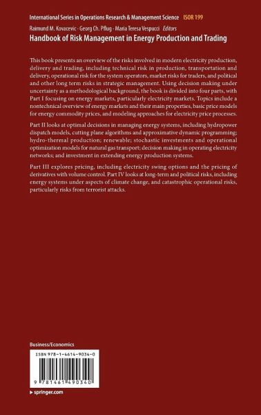 Part III explores pricing, including electricity swing options and the pricing of derivatives with volume control. Part IV looks at long-term and political risks, including energy systems under aspects of climate change, and catastrophic operational risks, particularly risks from terrorist attacks.