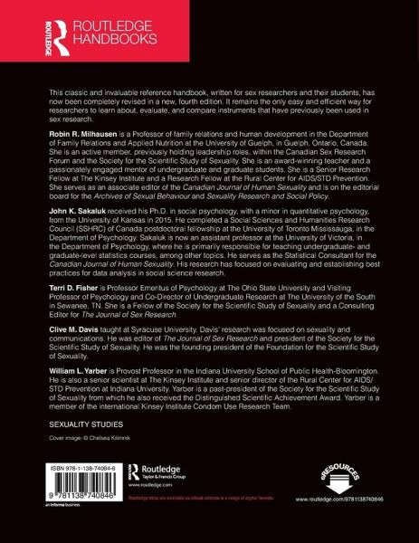 Robin R. Milhausen is a Professor of family relations and human development in the Department of Family Relations and Applied Nutrition at the University of Guelph, in Guelph, Ontario, Canada. She is an active member, previously holding leadership roles, within the Canadian Sex Research Forum and the Society for the Scientific Study of Sexuality. She is an award-winning teacher and a passionately engaged mentor of undergraduate and graduate students. She is a Senior Research Fellow at The Kinsey Institute and a Research Fellow at the Rural Center for AIDS/STD Prevention. She serves as an associate editor of the Canadian Journal of Human Sexuality and is on the editorial board for the Archives of Sexual Behaviour and Sexuality Research and Social Policy. John K. Sakaluk received his Ph.D. in social psychology, with a minor in quantitative psychology, from the University of Kansas in 2015. He completed a Social Sciences and Humanities Research Council (SSHRC) of Canada postdoctoral fellowship at the University of Toronto Mississauga, in the Department of Psychology. Sakaluk is now an assistant professor at the University of Victoria, in the Department of Psychology, where he is primarily responsible for teaching undergraduate- and graduate-level statistics courses, among other topics. He serves as the Statistical Consultant for the Canadian Journal of Human Sexuality. His research has focused on evaluating and establishing best practices for data analysis in social science research. Terri D. Fisher is Professor Emeritus of Psychology at the Ohio State University and Visiting Professor of Psychology and Co-Director of Undergraduate Research at The University of the South in Sewanee, TN. She is a fellow of the Society for the Scientific Study of Sexuality and consulting editor for The Journal of Sex Research. Clive M. Davis taught at Syracuse University. Davis' research was focused on sexuality and communications. He was editor of The Journal of Sex Research and president of the Society for the Scientific Study of Sexuality. He was the founding president of the Foundation for the Scientific Study of Sexuality. William L. Yarber is Provost Professor in the Indiana University School of Public Health-Bloomington. He is also a senior research fellow at The Kinsey Institute and senior director of the Rural Center for AIDS/STD Prevention at Indiana University. Yarber is a past-president of the Society for the Scientific Study of Sexuality from which he also received the Distinguished Scientific Achievement Award. Yarber is a member of the international Kinsey Institute Condom Use Research Team.