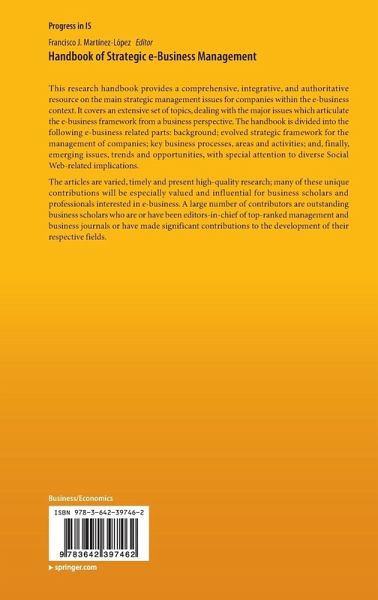 This research handbook provides a comprehensive, integrative, and authoritative resource on the main strategic management issues for companies within the e-business context. It covers an extensive set of topics, dealing with the major issues which articulate the e-business framework from a business perspective. The handbook is divided into the following e-business related parts: background; evolved strategic framework for the management of companies; key business processes, areas and activities; and, finally, emerging issues, trends and opportunities, with special attention to diverse Social Web-related implications.