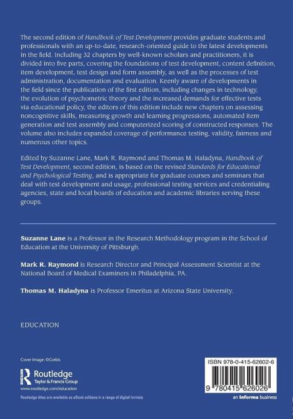 The second edition of the Handbook of Test Development provides graduate students and professionals with an up-to-date, research-oriented guide to the latest developments in the field. Including thirty-two chapters by well-known scholars and practitioners, it is divided into five sections, covering the foundations of test development, content definition, item development, test design and form assembly, and the processes of test administration, documentation, and evaluation. Keenly aware of developments in the field since the publication of the first edition, including changes in technology, the evolution of psychometric theory, and the increased demands for effective tests via educational policy, the editors of this edition include new chapters on assessing noncognitive skills, measuring growth and learning progressions, automated item generation and test assembly, and computerized scoring of constructed responses. The volume also includes expanded coverage of performance testing, validity, fairness, and numerous other topics.