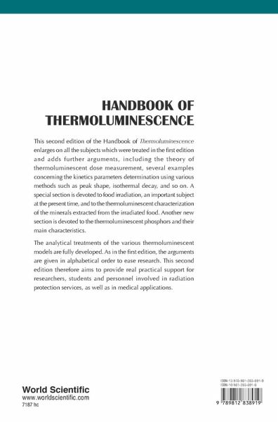 This second edition of the Handbook of Thermoluminescence enlarges on all the subjects which were treated in the first edition and adds further arguments, including the theory of thermoluminescent dose measurement, several examples concerning the kinetics parameters determination using various methods such as peak shape, isothermal decay, and so on. A special section is devoted to food irradiation, an important subject at the present time, and to the thermoluminescent characterization of the minerals extracted from the irradiated food. Another new section is devoted to the thermoluminescent phosphors and their main characteristics. The analytical treatments of the various thermoluminescent models are fully developed. As in the first edition, the arguments are given in alphabetical order to ease research. This second edition therefore aims to provide real practical support for researchers, students and personnel involved in radiation protection services, as well as in medical applications.