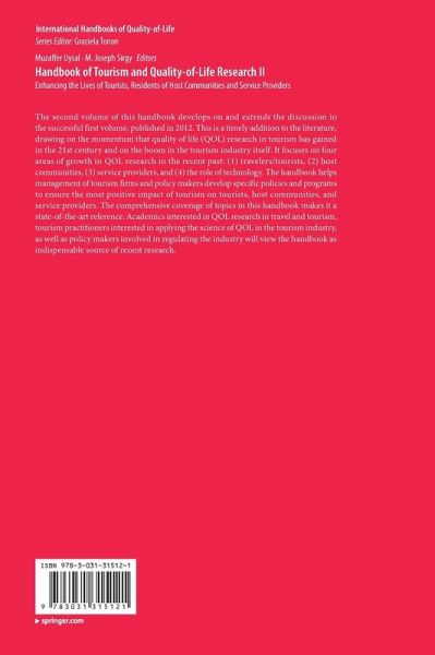 The second volume of this handbook develops on and extends the discussion in the successful first volume, published in 2012. This is a timely addition to the literature, drawing on the momentum that quality of life (QOL) research in tourism has gained in the 21st century and on the boom in the tourism industry itself. It focuses on four areas of growth in QOL research in the recent past: (1) travelers/tourists, (2) host communities, (3) service providers, and (4) the role of technology. The handbook helps management of tourism firms and policy makers develop specific policies and programs to ensure the most positive impact of tourism on tourists, host communities, and service providers. The comprehensive coverage of topics in this handbook makes it a state-of-the-art reference. Academics interested in QOL research in travel and tourism, tourism practitioners interested in applying the science of QOL in the tourism industry, as well as policy makers involved in regulating the industry will view the handbook as indispensable source of recent research.