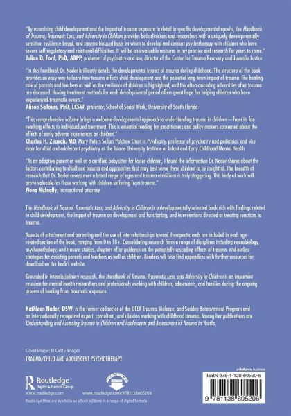 "In this handbook Dr. Nader brilliantly details the developmental impact of trauma during childhood. The structure of the book provides an easy way to learn how trauma affects child development and the potential long-term impact of trauma. The healing role of parents and teachers as well as the resilience of children is highlighted, and the often cascading adversities after trauma are discussed. Having treatment methods for each developmental period offers great hope for helping children who have experienced traumatic events."-Alison Salloum, PhD, LCSW, professor, School of Social Work, University of South Florida