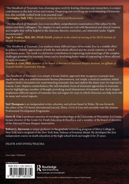 The Handbook of Traumatic Loss adopts a broad, holistic approach that recognizes traumatic loss much more fully as a multidimensional human phenomenon, not simply a medical condition. Initial chapters build a foundation for understanding traumatic loss and explore the many ways we respond to trauma. Later chapters counterbalance the individualistic focus of dominant approaches to traumatic loss by highlighting a number of thought-provoking social dimensions of traumatic loss. Each chapter emphasizes different aspects of traumatic loss and argues for ways in which clinicians can help deal with its many and varied impacts.