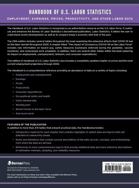 The Handbook of U.S. Labor Statistics: Employment, Earnings, Prices, Productivity, and Other Labor Data continues the Bureau of Labor Statistics' (BLS) discontinued publication, Labor Statistics. This edition includes several new tables throughout the book examining the extensive role that COVID-19 had on the labor market throughout 2020.