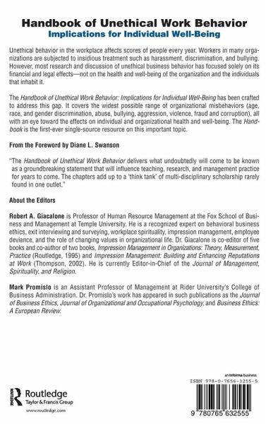1. Ethical Impact Theory (EIT): Unethical Work Behavior and Well-Being Part I. Attacking Others: Revenge, Aggression, Bullying, and Abuse 2. Beyond the Consequences to the Victim: The Impact of Abusive Supervision on Third-Party Observers 3. Coping with Unethical Behavior: Forgoing the Sweetness of Revenge for the Healthy Choice of Forgiveness 4.The Morality and Ethics of Workplace Revenge: Avengers' Moral Considerations and the Consequences of Revenge for Stakeholder Well-Being 5. Bullying and Well-Being 6. Workplace Aggression, Unethical Behavior, and Employee Well-Being: An "Aggressive" Examination of the Issues Part II. Harmful Behaviors and Work Stress 7. The Impact of Ostracism on Well-Being in Organizations 8. Crafting an Image at Another's Expense: Understanding Unethical Impression Management in Organizations 9. Ethical and Unethical Leader Behaviors and Their Impact on Individual Well-Being and Deviance 10. Age Discrimination in the Workplace and Well-Being 11.Unethical Work Behavior as a Stressor Part III. Individual Differences, Justice, and Moral Emotions 12. Machiavellianism, Unethical Behavior, and Well-Being in Organizational Life 13. Organizational Justice and Cardiovascular Health 14. Moral Emotions and Unethical Behavior: The Case of Shame and Guilt 15. Ethics Position Theory and Unethical Work Behavior 16. Perceived Justice and Well-Being at Work: How and for Whom Do Unethical Practices Matter? 17. Ethics, Empathy, and Employment: Seeking a Compassionate Workplace Part IV. Organizational and Societal Perspectives 18. Ethical Climate: Causes, Consequences, and Implications for Improving Well-Being 19. The Virtuous Business Cycle Model: A Proposal 20. Macro-Ethinomics: The Long-Term Costs of Short-Term Thinking