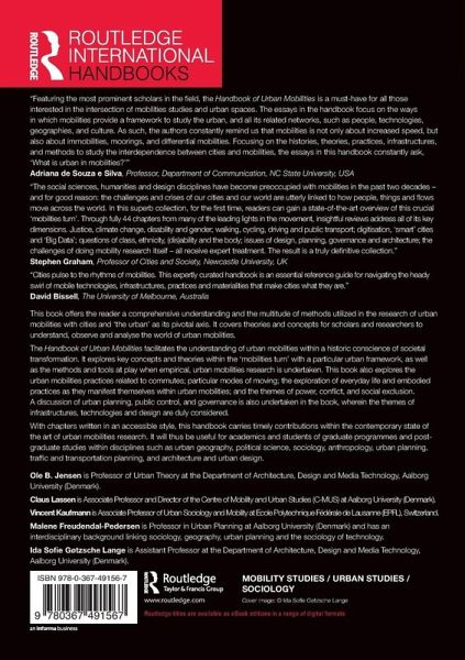 "Featuring the most prominent scholars in the field, the Handbook of Urban Mobilities is a must have for all those interested in the intersection of mobilities studies and urban spaces. The essays in the handbook focus on the ways in which mobilities provides a framework to study the urban, and all its related networks, such as people, technologies, geographies, and culture. As such, the authors constantly remind us that mobilities is not only about increased speed, but also about immobilities, moorings, and differential mobilities. Focusing on the the histories, theories, practices, infrastructures and methods to study the interdependence between cities and mobilities, the essays in this handbook constantly ask, "What is urban in mobilities?"