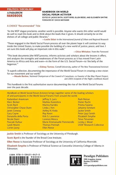 The World Social Forum (WSF) has become the focus for a diverse array of movements advancing alternative visions of globalisation. The numerous WSF's have helped to connect activists in an increasingly dense network of advocates for radical social change. They have mobilised hundreds of thousands of people and may be one of the most important political developments of our time. The Handbook of World Social Forum Activism brings together leading scholars of the social forum process from North America and Europe. The collection contributes to the ongoing process of reflection from the WSF experience, and is accessible to activists, students and scholars alike.