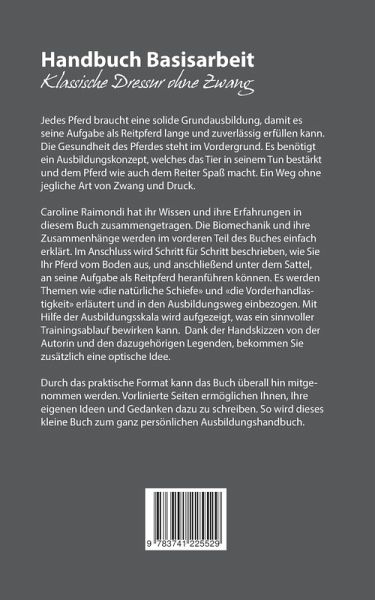 Jedes Pferd braucht eine solide Grundausbildung, damit es seine Aufgabe als Reitpferd lange und zuverlässig erfüllen kann. Die Gesundheit des Pferdes steht im Vordergrund. Es benötigt ein Ausbildungskonzept, welches das Tier in seinem Tun bestärkt und dem Pferd wie auch dem Reiter Spaß macht. Ein Weg ohne jegliche Art von Zwang und Druck. Caroline Raimondi hat ihr Wissen und ihre Erfahrungen in diesem Buch zusammengetragen. Die Biomechanik und ihre Zusammenhänge werden im vorderen Teil des Buches einfach erklärt. Im Anschluss wird Schritt für Schritt beschrieben, wie Sie Ihr Pferd vom Boden aus und anschließend unter dem Sattel an seine Aufgabe als Reitpferd heranführen können. Es werden Themen wie «die natürliche Schiefe» und «die Vorderhandlastigkeit» erläutert und in den Ausbildungsweg einbezogen. Mit Hilfe der Ausbildungsskala wird aufgezeigt, was ein sinnvoller Trainingsablauf bewirken kann. Jeder einzelne Punkt der Ausbildungsskala wird genau erklärt. Dank der Handskizzen von der Autorin und den dazugehörigen Legenden, bekommen Sie zusätzlich eine optische Idee. Durch das praktische Format kann das Buch überallhin mitgenommen werden. Vorlinierte Seiten ermöglichen Ihnen, Ihre eigenen Ideen und Gedanken dazu zu schreiben. So wird dieses kleine Buch zum ganz persönlichen Ausbildungshandbuch.
