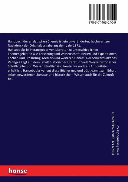 Handbuch der analytischen Chemie ist ein unveränderter, hochwertiger Nachdruck der Originalausgabe aus dem Jahr 1871.