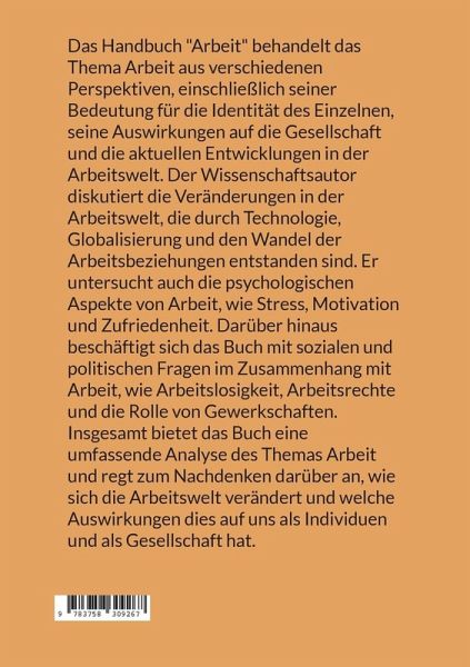 Das Handbuch "Arbeit" behandelt das Thema Arbeit aus verschiedenen Perspektiven, einschließlich seiner Bedeutung für die Identität des Einzelnen, seine Auswirkungen auf die Gesellschaft und die aktuellen Entwicklungen in der Arbeitswelt. Der Wissenschaftsautor diskutiert die Veränderungen in der Arbeitswelt, die durch Technologie, Globalisierung und den Wandel der Arbeitsbeziehungen entstanden sind. Er untersucht auch die psychologischen Aspekte von Arbeit, wie Stress, Motivation und Zufriedenheit. Darüber hinaus beschäftigt sich das Buch mit sozialen und politischen Fragen im Zusammenhang mit Arbeit, wie Arbeitslosigkeit, Arbeitsrechte und die Rolle von Gewerkschaften. Insgesamt bietet das Buch eine umfassende Analyse des Themas Arbeit und regt zum Nachdenken darüber an, wie sich die Arbeitswelt verändert und welche Auswirkungen dies auf uns als Individuen und als Gesellschaft hat.