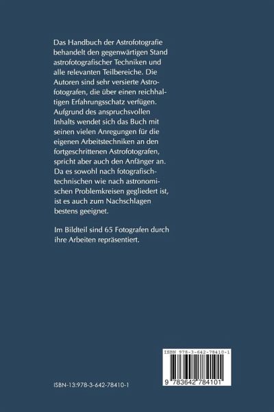 Das Handbuch der Astrofotografie behandelt den gegenwärtigen Stand astrofotografischer Techniken und alle relevanten Teilbereiche. Die Autoren des Buches sind sehr versierte Astrofotografen, die über einen reichhaltigen Erfahrungsschatz verfügen. Aufgrund des anspruchsvollen Inhalts wendet sich das Buch mit vielen Anregungen für die eigenen Arbeitstechniken an den fortgeschrittenen Astrofotografen, spricht aber auch den Anfänger an. Im Bildteil sind 65 Fotografen durch ihre Arbeiten repräsentiert. Das Buch hebt sich von der deutschsprachigen Konkurrenzliteratur deutlich ab, weil hier alle Teilbereiche der Astrofotografie angesprochen werden. Es ist sowohl nach fotografisch-technischen als auch nach astronomischen Problemkreisen gegliedert und so zum Nachschlagen bestens geeignet.